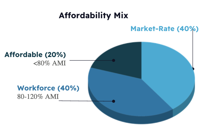 With over 900 housing units planned, the development will prioritize a mixed-income approach to expand access to attainable housing in Ithaca, New York. Outside of New York City, Ithaca is the second most expensive city in the state to rent a one-bedroom apartment, with a median monthly rent of $2,003 as of February 2022 (Dwellsy). Our proposed affordability mix—20% affordable, 40% workforce, and 40% market-rate housing— will provide a range of options to meet the needs of residents across income levels. By combining new construction with adaptive reuse, the project will ease housing pressures, support long-term community stability, and help reduce inequities in one of New York’s most unaffordable housing markets.